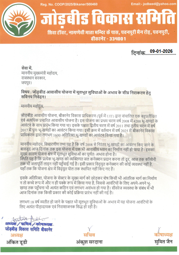 बीकानेर। जोड़बीड़ आवासीय योजना को लेकर ‘जोड़बीड़ विकास समिति’ ने मुख्यमंत्री और वित्त मंत्री को ज्ञापन दिया है। जिसमें जोड़बीड़ आवासीय योजना की पुनर्जीवन के लिये आगामी राजस्थान बजट 2026-27 में विशेष बजट पैकेज की मांग की गई है। समिति की मांग है कि जोड़बीड़ आवासीय योजना के विकास के लिये जल्द से जल्द संबंधित अधिकारियों को निर्देशित किया जाए।
